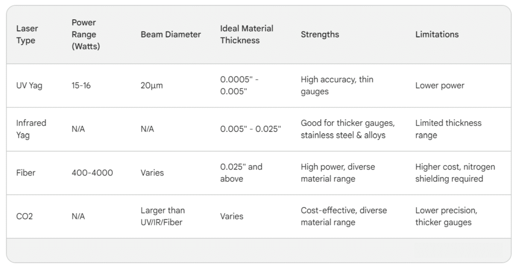 - UV or Ultraviolet – These systems use a very small beam diameter, in conjunction with low power use. Often the only choice for stainless steel foils from .0005” up to .005” mils thick. Used for projects requiring tight tolerance, smooth, clean edges.